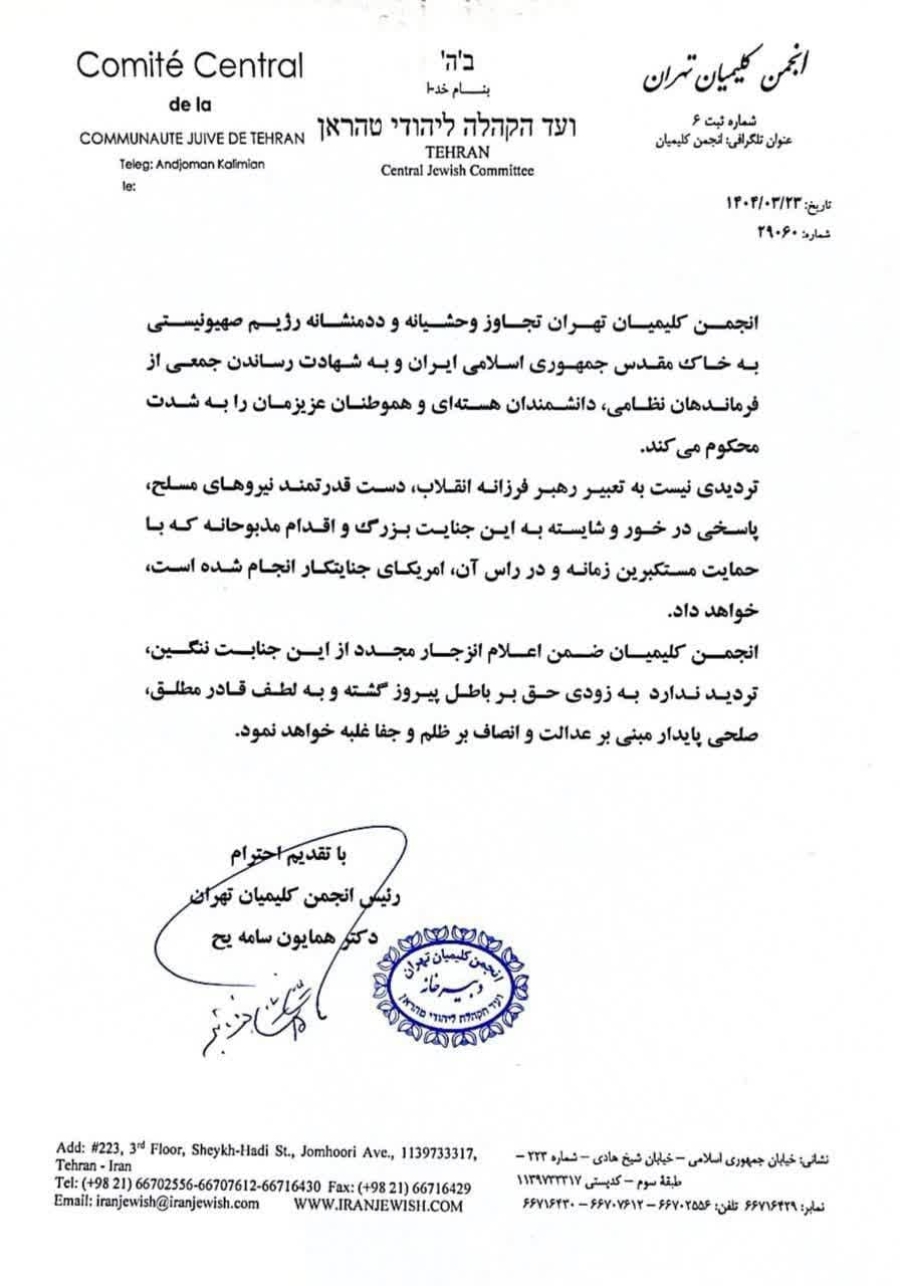 انجمن کلیمیان تهران، تجاوز رژیم صهیونیستی به خاک ایران و شهادت فرماندهان نظامی و دانشمندان هستهای به مردم بیگناه را محکوم کرد.