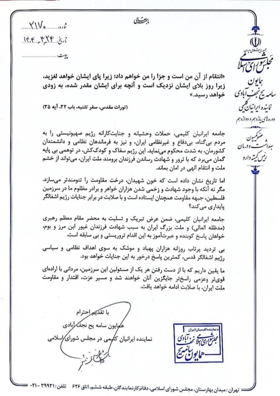 آقای همایون سامه یح نجف آبادی، نماینده یهودیان ایران در مجلس شورای اسلامی، تجاوز رژیم صهیونیستی به خاک ایران و شهادت فرماندهان نظامی و دانشمندان هستهای به مردم بیگناه را محکوم کرد.