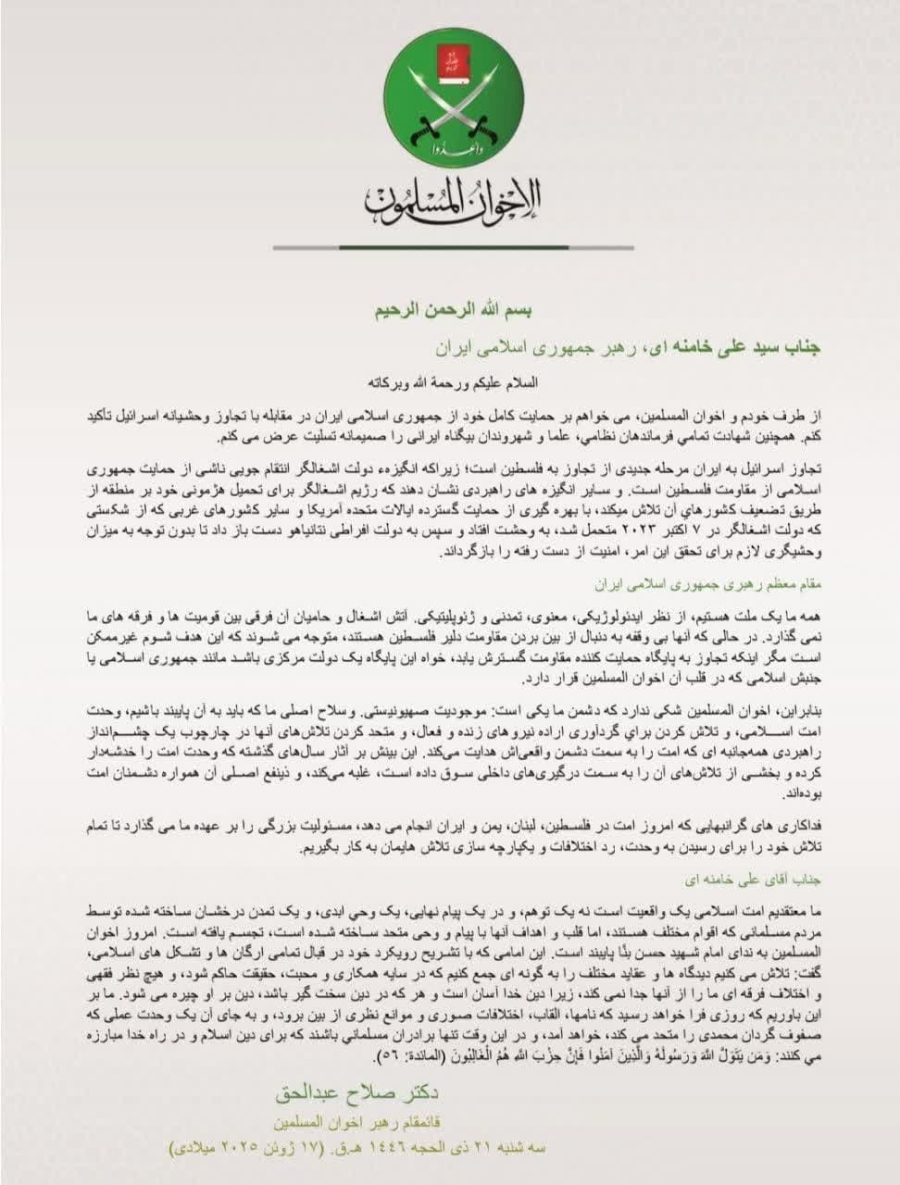 ترجمه پیام کم نظیر و همدلانه قائم مقام مرشد عام اخوان المسلمین (دکتر صلاح عبدالحق) خطاب به مقام معظم رهبری